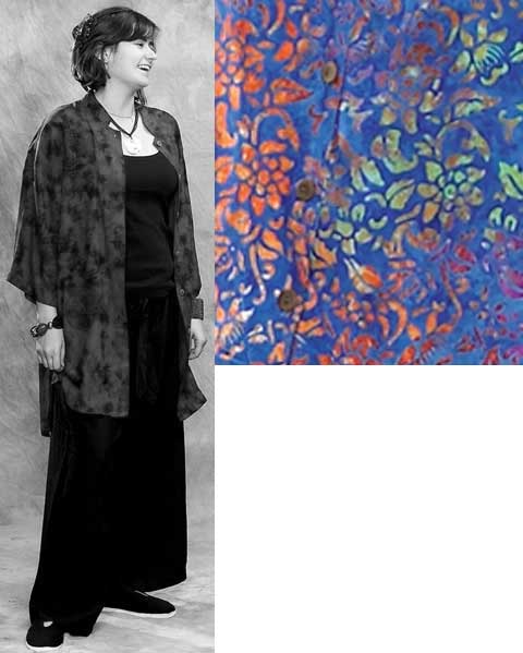 This oversize men’s style shirt comes in one large size. It has side slits and drapes down lower in the back. It is available in several batiks. 100% Rayon. Okay to machine wash in cold water. Hang to dry.