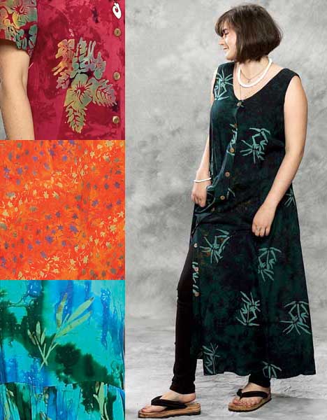 This sleeveless batik dress has a button front with princess seams for a flattering fit. Please choose sizes below. 100% Rayon. Okay to machine wash in cold water. Hang to dry.