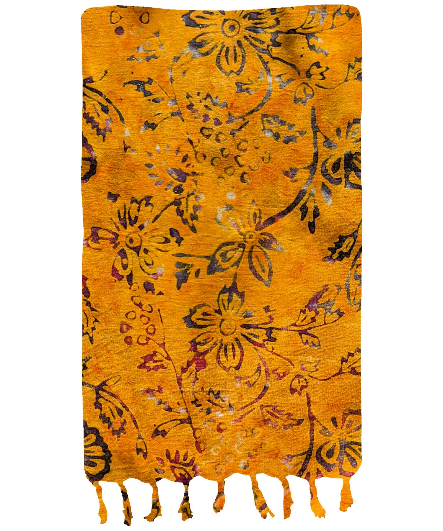 This is an artisan-made, premium batik sarong on high thread-count, clothing-weight rayon; a bright marigold yellow sarong with a hand-painted foliage motif. Made in Bali. Machine washable and highly-enjoyable.