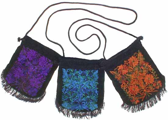 Black Velvet Bag with Embroidered Flowers in Purple, Blue, Green or Orange. 9″ x 7″. Made in Guatemala.