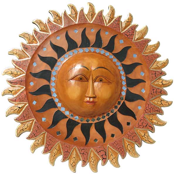 Sun Burst Wall-Hanging with Small Mirrors. A beautiful, fiery wooden sun decorated with small mirror tiles. Hand-made in Bali. 16″